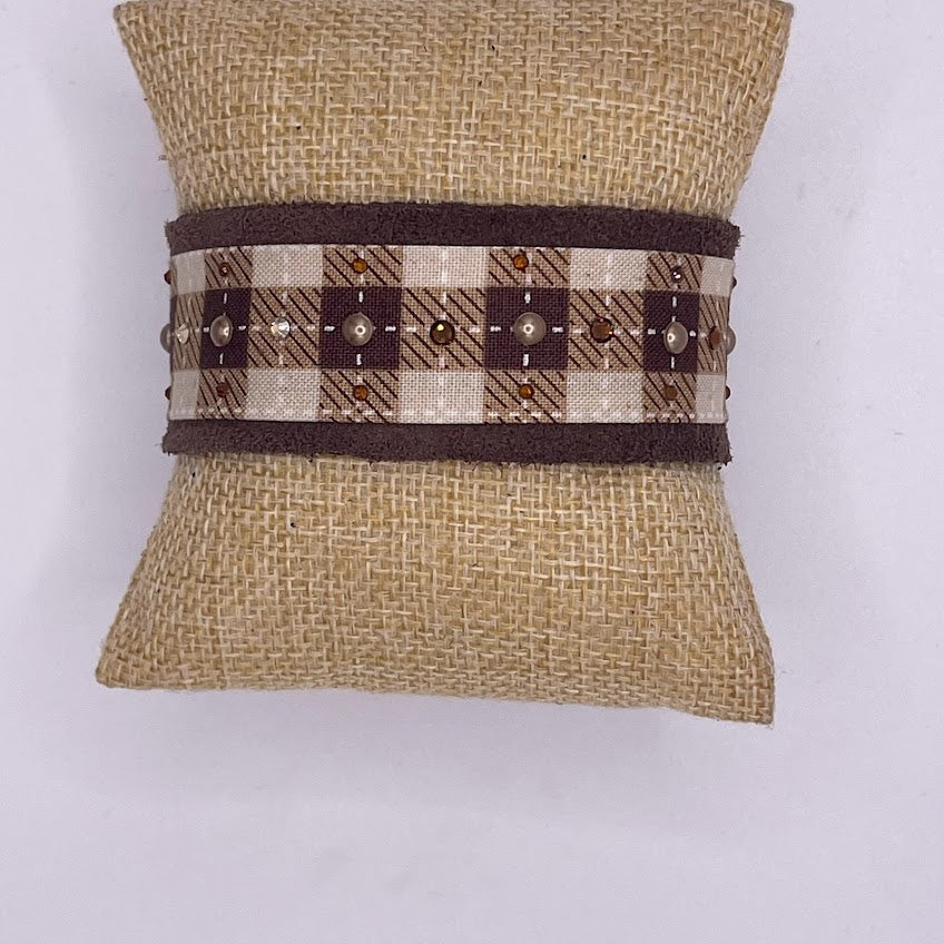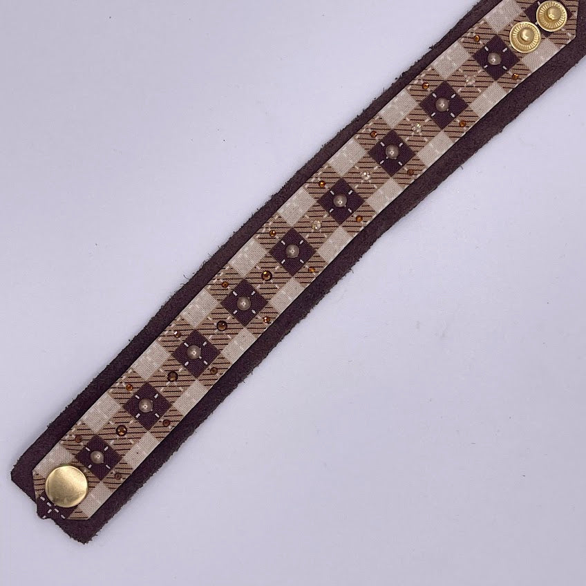 Beautifully handmade suede leather bracelet cuff. Soft brown suede cuff topped with western brown and tan check print fabric that has been hand-painted, adorned with sparkling Swarovski crystals and pearls. There are two gold high-quality snaps have been added to allow for adjustability and comfort fit. Bracelet is 8.25" long and 1.25" wide.