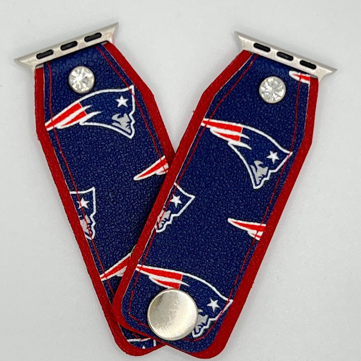 Calling all Patriot fans! Don't miss out on this one-of-a-kind custom-made New England Patriots watchband! The bottom layer is made with soft pebbled red leather and topped with New England Patriots coated canvas that has been repurposed from a DB bag. The band is secured with silver fitting connectors that will slide into your apple watch securely. There are two silver high-quality snaps have been added to allow for adjustability and comfort fit. Each band is approximately 3.5 inches with snaps at .5 and 1.25. The secure clear crystal adds a nice little bling to the band! Fits the apple watch (38/40 mm band).