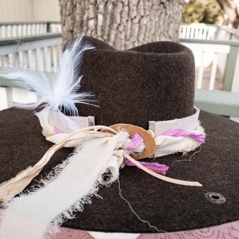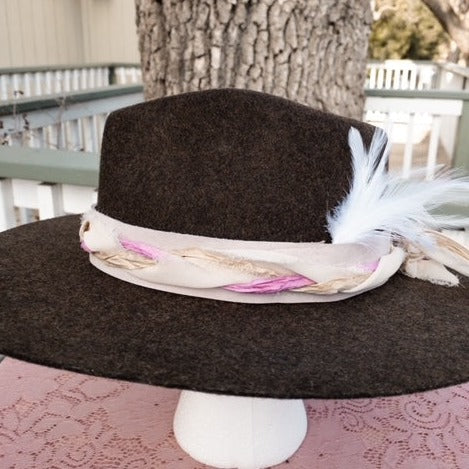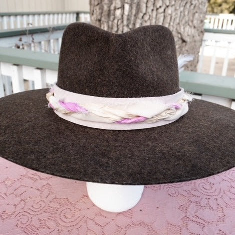 This hatband has amazing embellishments and detail! The band is 22.5" x 1.5" and has adjustable tan suede ties in the back so it can fit hats from 22.5-34". The bottom layer is a soft blush pink with a hint of lavender. It is topped with three different colors of silk ribbon that bring out the color of the leather. The hatband wouldn't be complete without a little white feather that adds just the perfect finale to this hatband.