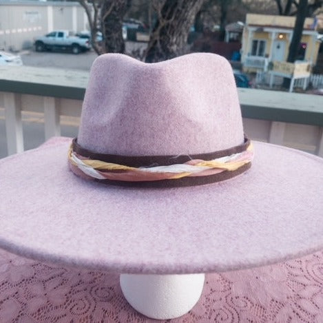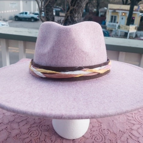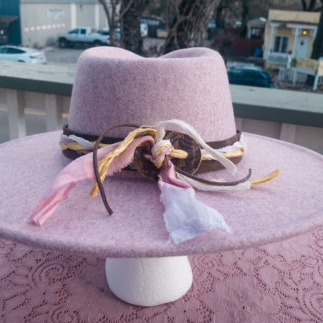This hatband is gorgeous and has just a little extra added to it. The band is 22.5" x 1.5" and has adjustable ties in the back so it can fit hats from 22.5-34". The bottom layer is soft chocolate brown suede. The designer has then used three types of silk ribbons that complement the leather and really bring the color to life.