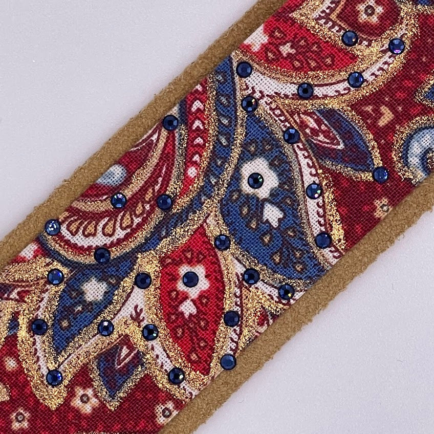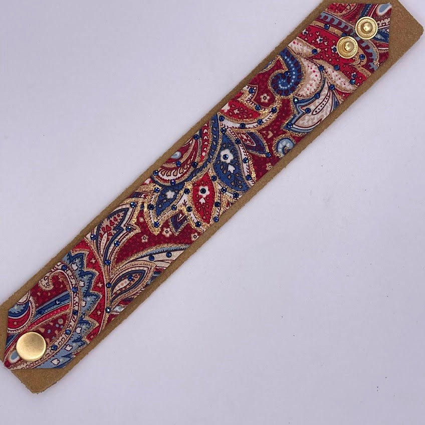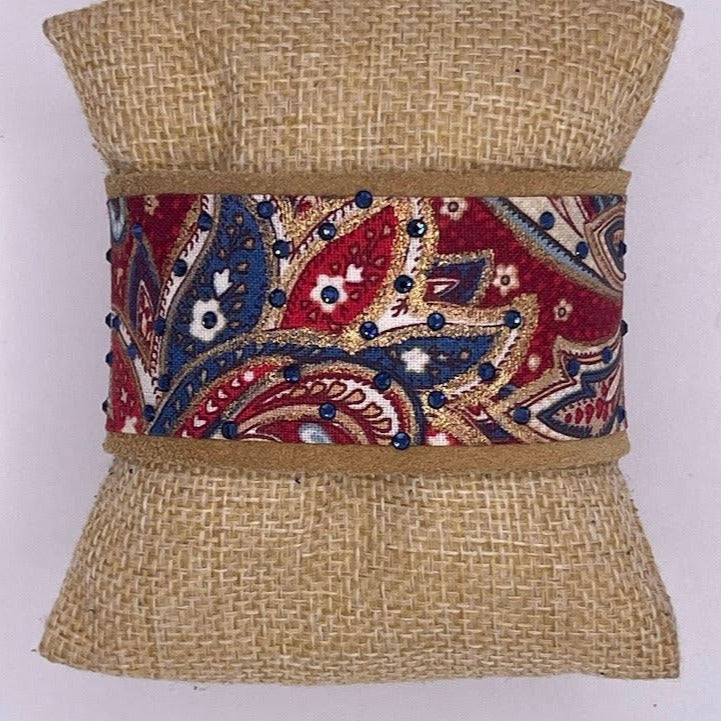 Beautifully handmade suede leather bracelet cuff. Soft tan suede cuff topped with red, blue and tan paisley print fabric that has been hand-painted, adorned with sparkling clear Swarovski crystals. There are two gold high-quality snaps have been added to allow for adjustability and comfort fit. Bracelet is 8.25" long and 1.5" wide.