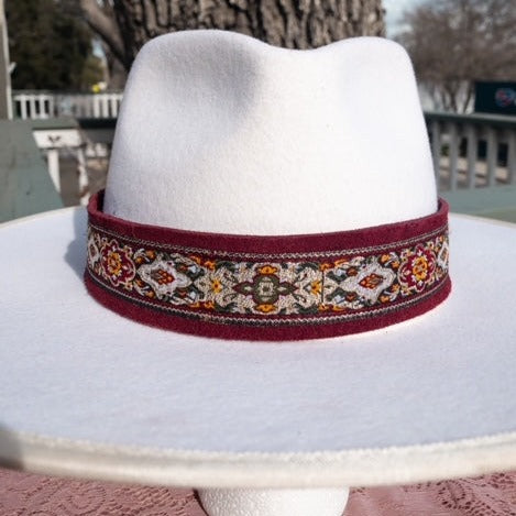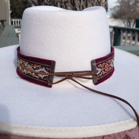 This hatband has amazing embellishments and detail! The band is 22.5" x 1.5" and has adjustable tan suede ties in the back so it can fit hats from 22.5-34". The beautiful wine green, gold, and maroon ribbon is bright and adds a pop to any color hat you put it on. The bottom layer is a soft maroon/wine suede leather that will look good on any color hat. The band is secured by two gold tie clamps in the back to give it a nice, finished look.